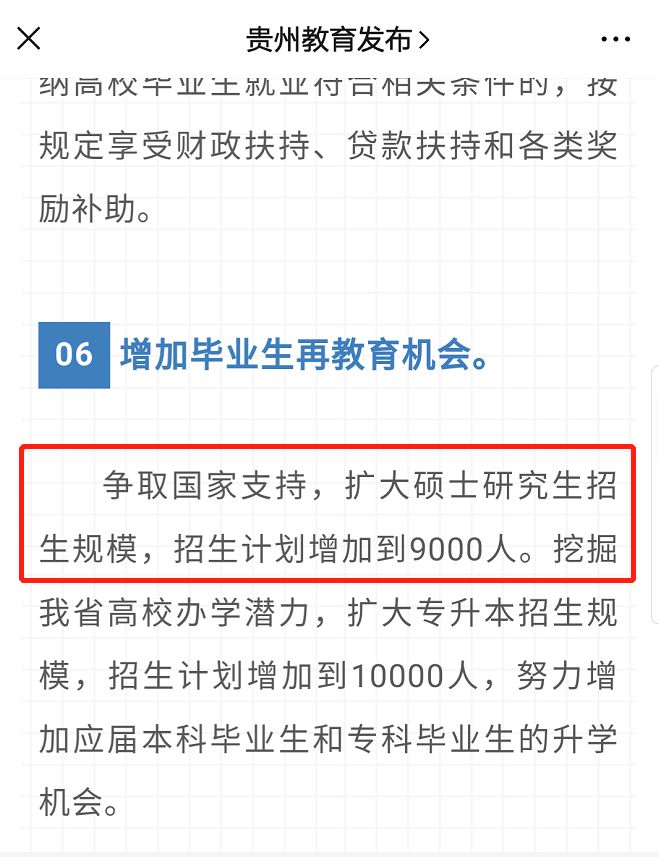 3月17日,贵州省委教育工委、省教育厅印发《促进2020年高校毕业生就业创业十条措施》,在文中提到关于“争取国家支持,扩大硕士研究生招生规模,招生计划增加到9000人。”
