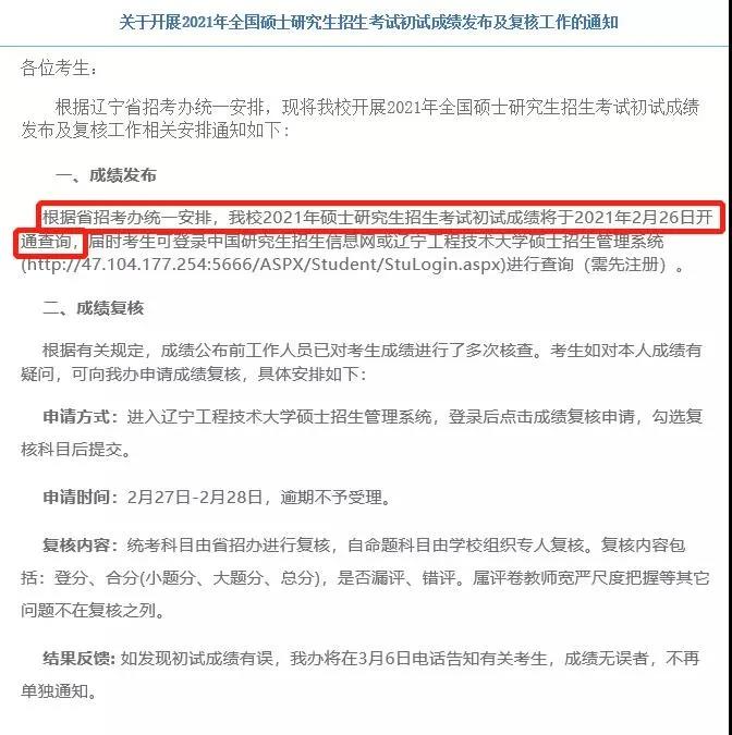 根据省招考办统一安排,该校2021年硕士研究生招生考试初试成绩将于2021年2月26日开通查询,届时考生可登录中国研究生招生信息网或辽宁工程技术大学硕士招生管理系统(http://47.104.177.254:5666/ASPX/Student/StuLogin.aspx)进行查询(需先注册)。